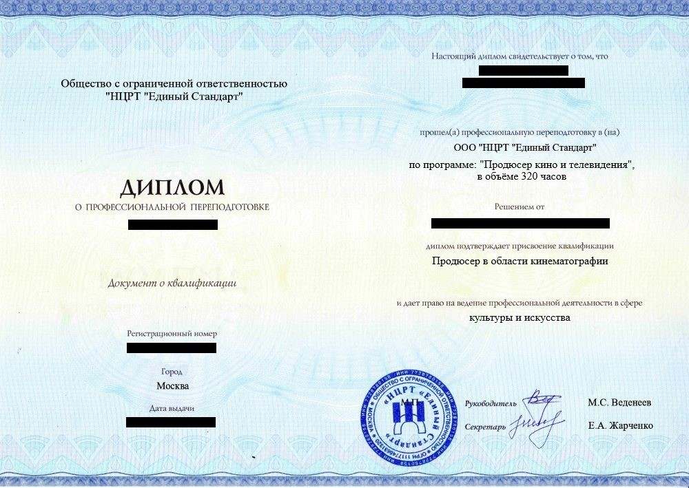 • «Продюсер в области кинематографии» с правом ведения профессиональной деятельности в сфере культуры и искусства