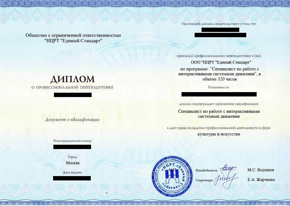 • «Специалист по работе с интерактивными системами движения» с правом ведения профессиональной деятельности в сфере культуры и искусства