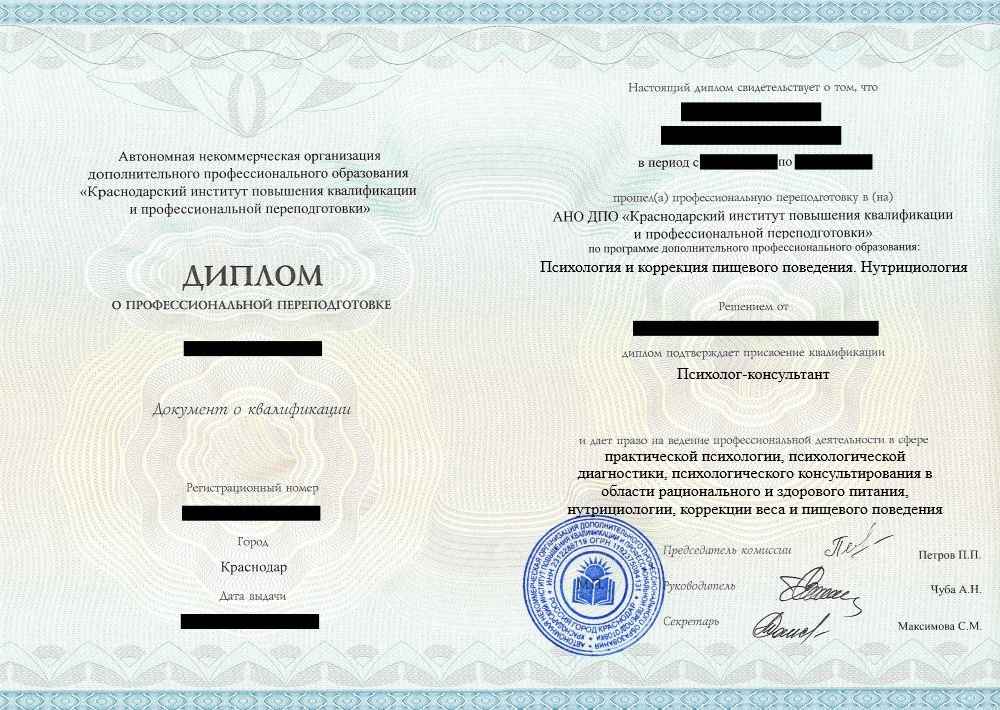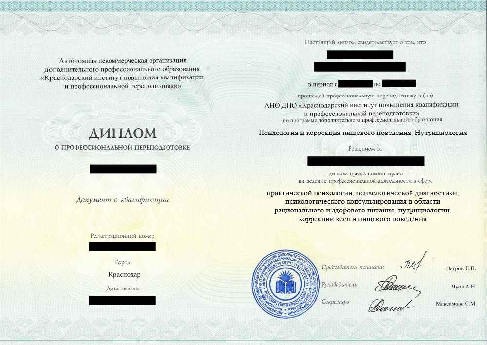 • 650 часов — право ведения профессиональной деятельности в сфере практической психологии, психологической диагностики, психологического консультирования в области рационального и здорового питания, нутрициологии, коррекции веса и пищевого поведения;